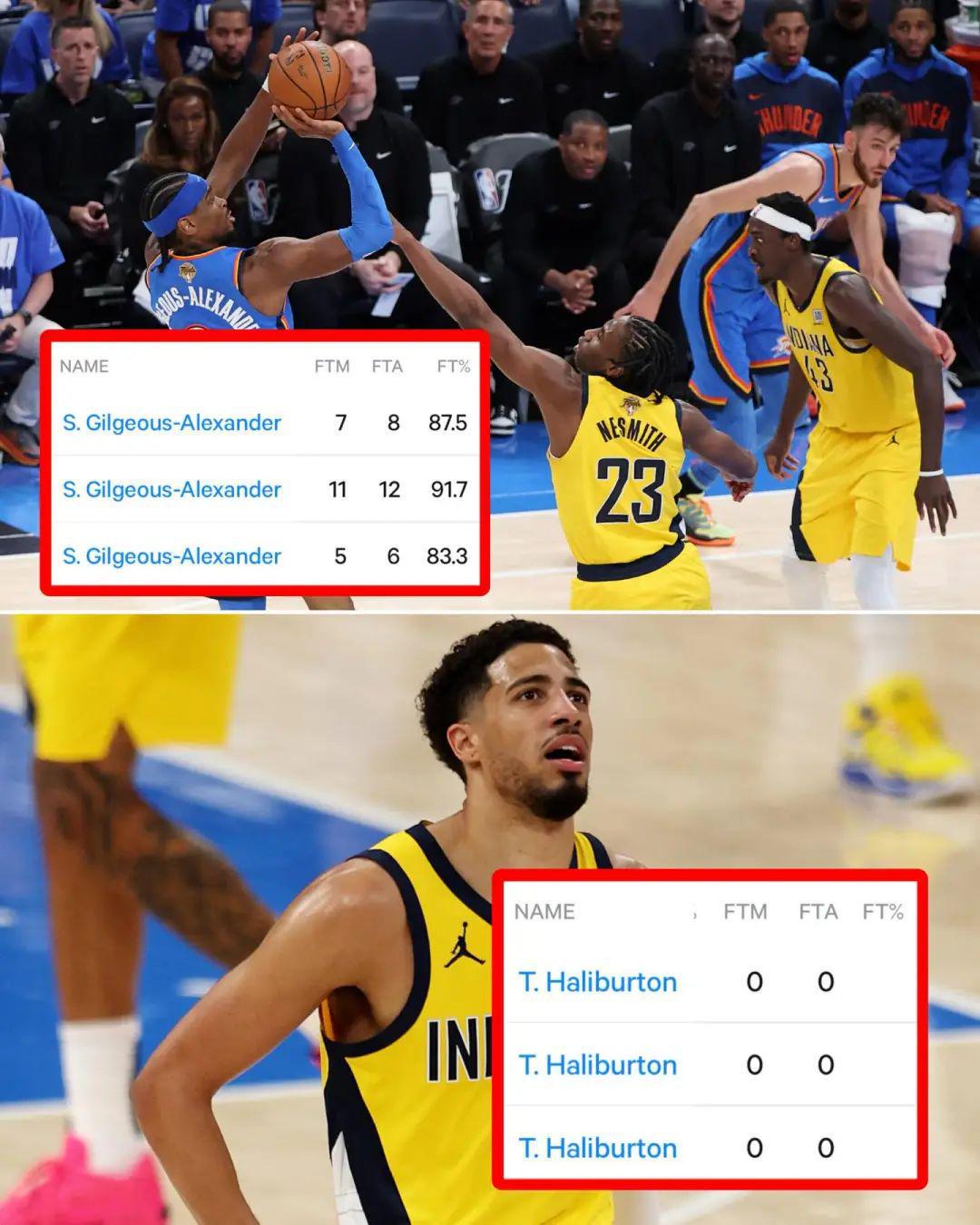 总决赛三场SGA罚球26次 哈利伯顿一次都没有
