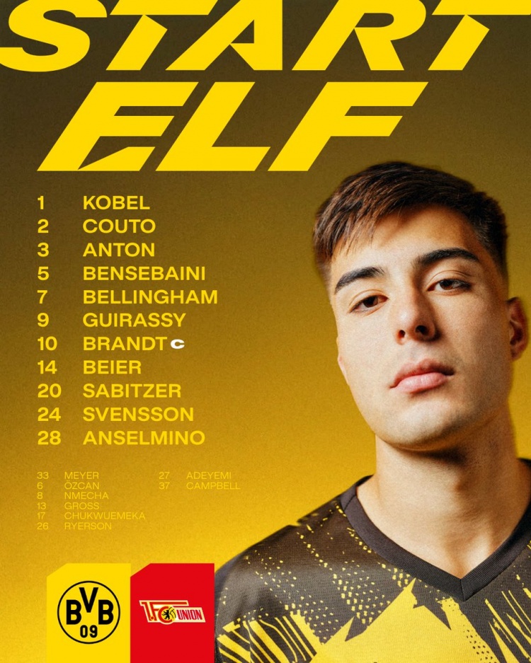 多特首发:1-科贝尔、2-扬-库托、3-安东、5-本塞拜尼、7-乔布-贝林厄姆、9-吉拉西、10-布兰特、14-拜尔、20-萨比策、24-斯文松、28-安塞尔米诺